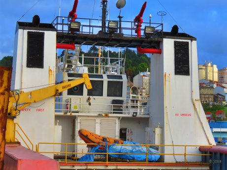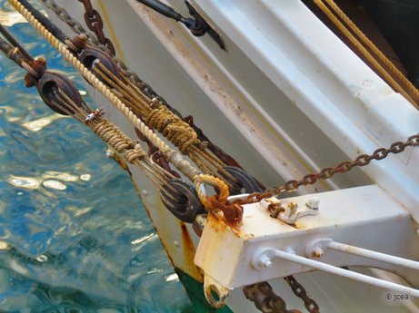 Carabela vista desde la playa de Samil, a tope de Zoom de la cámara. Esperaba verla un par de días después, en el puerto, pero ese y otros barcos estaban atracados en otros muelles para realizar reparaciones.