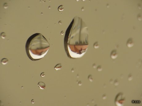Efecto lente en las gotas de agua. Lo que se ve es la imagen invertida del edificio de enfrente.