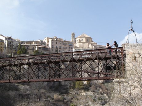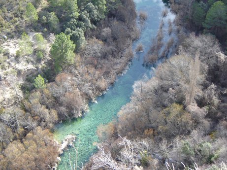 Abajo, el río Júcar. Se puede bajar por una escalera. Hay un paseo junto al cauce.