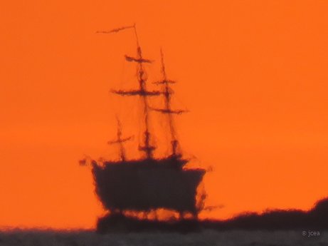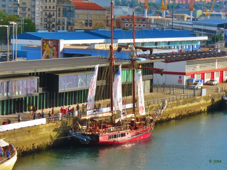 Carabela vista desde la playa de Samil, a tope de Zoom de la cámara. Esperaba verla un par de días después, en el puerto, pero ese y otros barcos estaban atracados en otros muelles para realizar reparaciones.