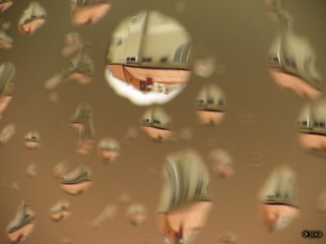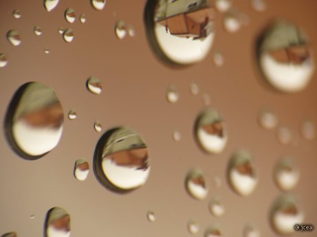 Efecto lente en las gotas de agua. Lo que se ve es la imagen invertida del edificio de enfrente.