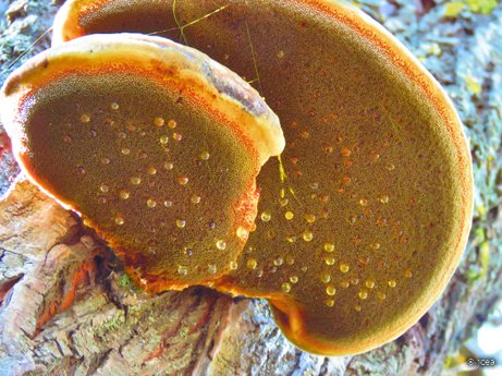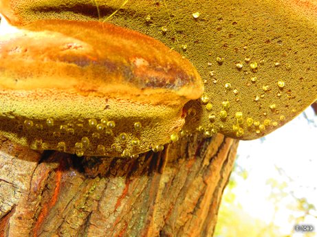 Estas gotas de agua bajo el hongo son reales. No había llovido ni nada. Parece condensación o agua generada por el hongo.