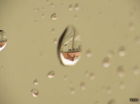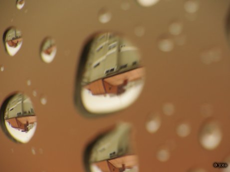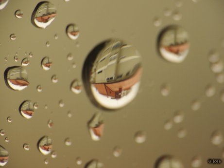 Efecto lente en las gotas de agua. Lo que se ve es la imagen invertida del edificio de enfrente.