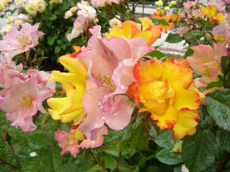 Las flores estaban mojadas porque acababan de poner los aspersores unos minutos antes.