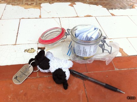 Primer día y primera ascensión fuerte y bajo un sol aplastante a la caza de un caché. El vicio es el vicio.