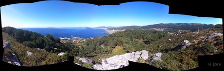 Panorámica de la parte exterior de la ría de Vigo desde un mirador cercano.