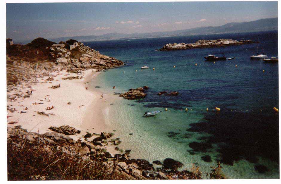 No hace falta irse al caribe para tener playas paradisíacas. Las boyas delimitan una zona de seguridad en la que las embarcaciones (barcos, zodiacs, motos acuáticas, etc.) están prohibidas. Así te puedes bañar tranquilo. Al fondo, Vigo.