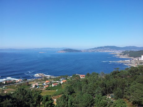 Panorámica de la parte exterior de la ría de Vigo desde un mirador cercano.